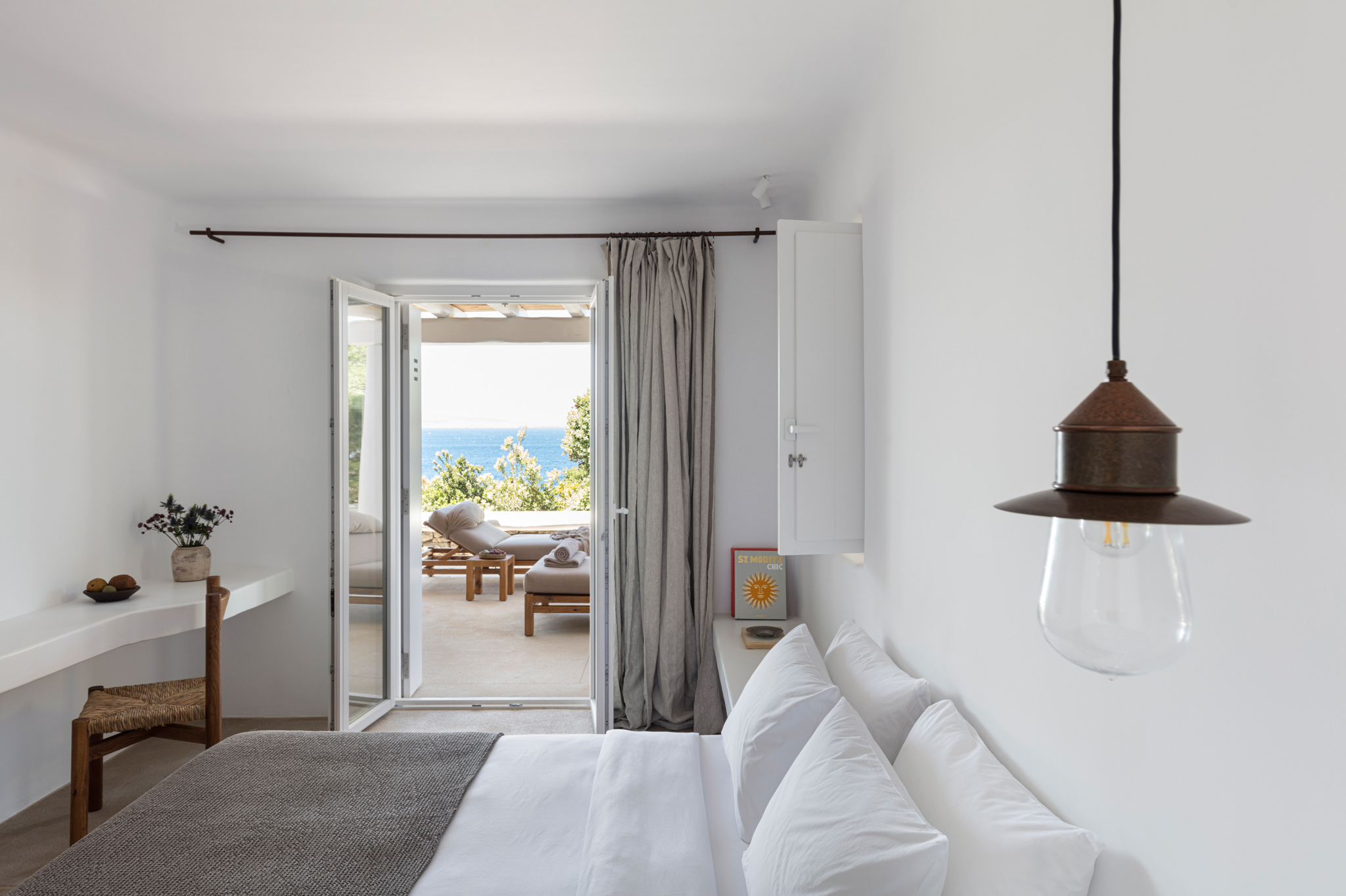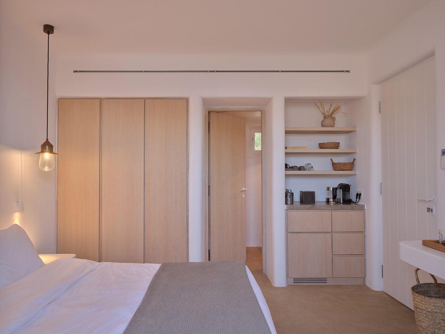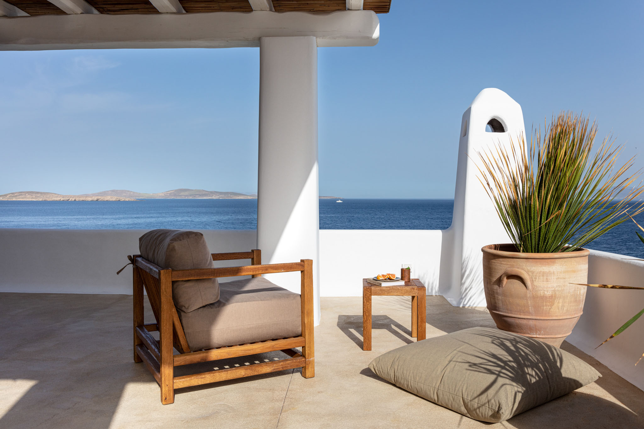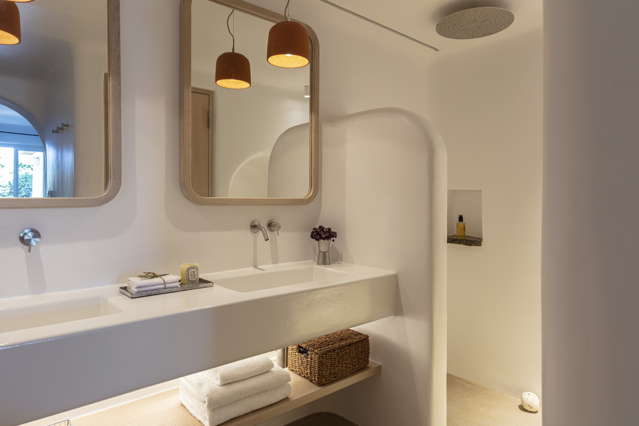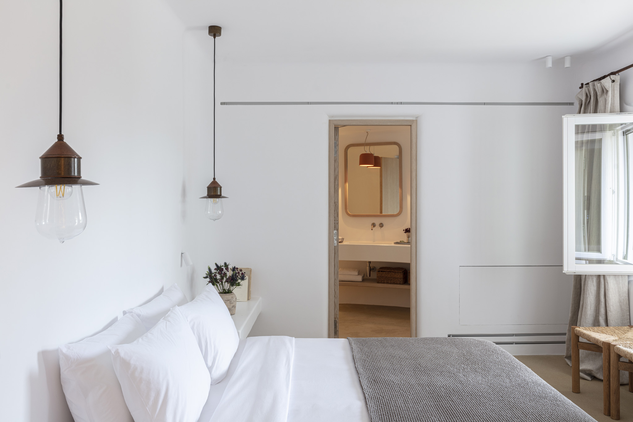 – 1 master double bedroom, en-suite bathroom, double sinks, private shaded terrace, sea&sunset views overlooking Delos & Rhenia islands