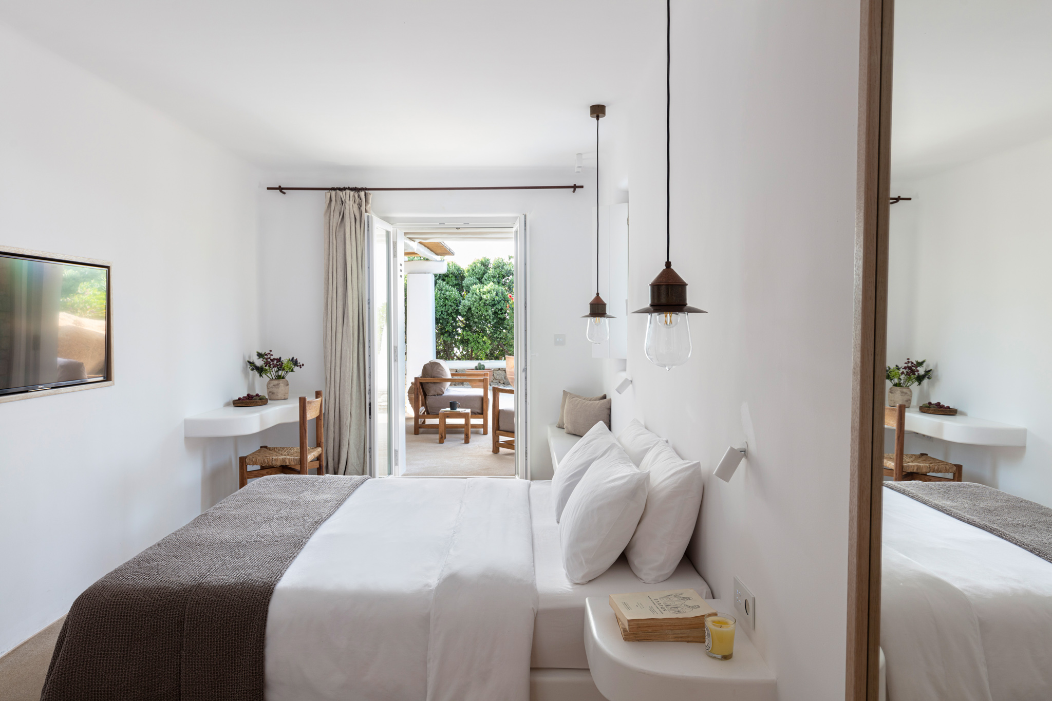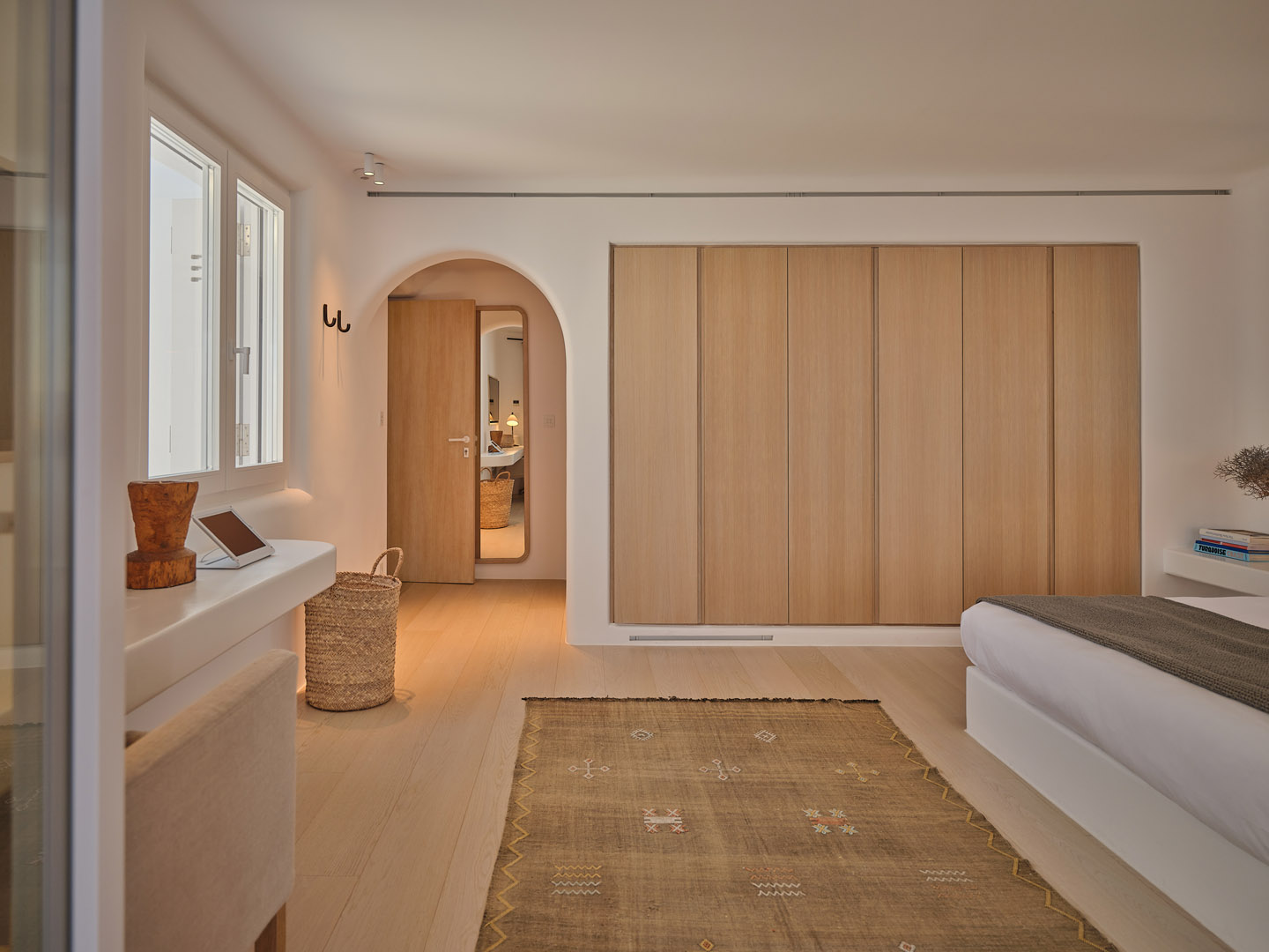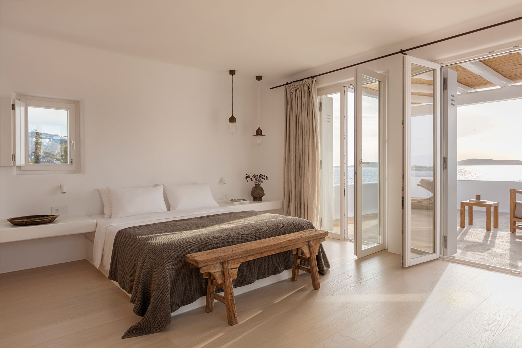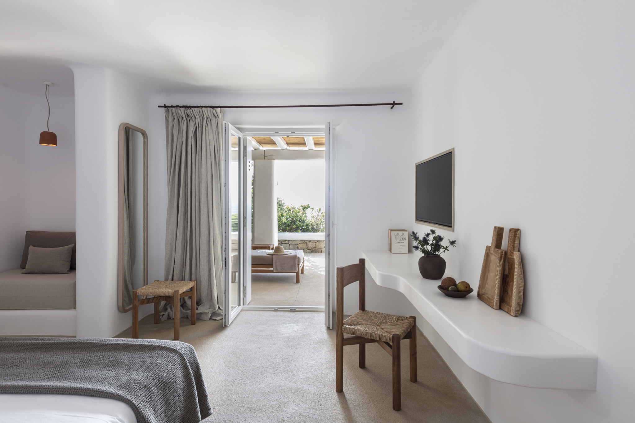 – 1 master double bedroom, en-suite bathroom, double sinks, private shaded terrace, sea&sunset views overlooking Delos & Rhenia islands