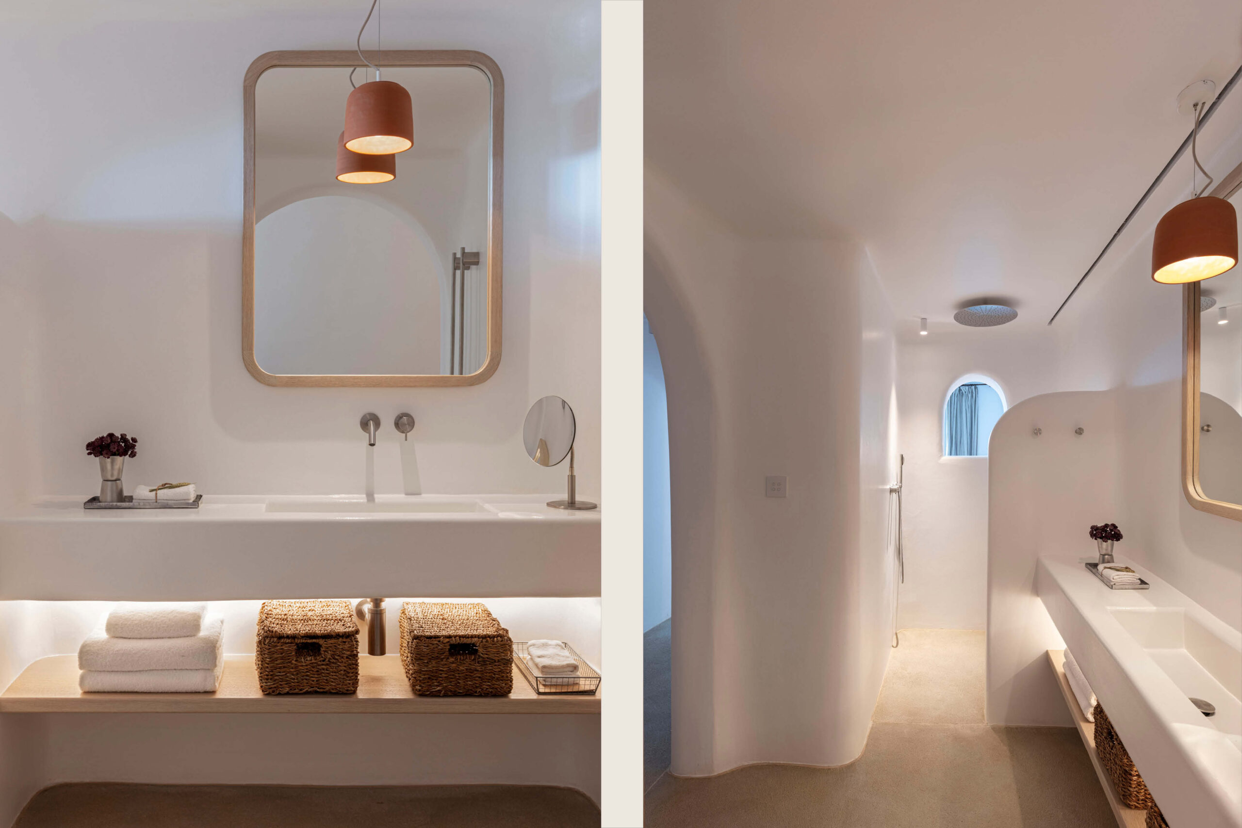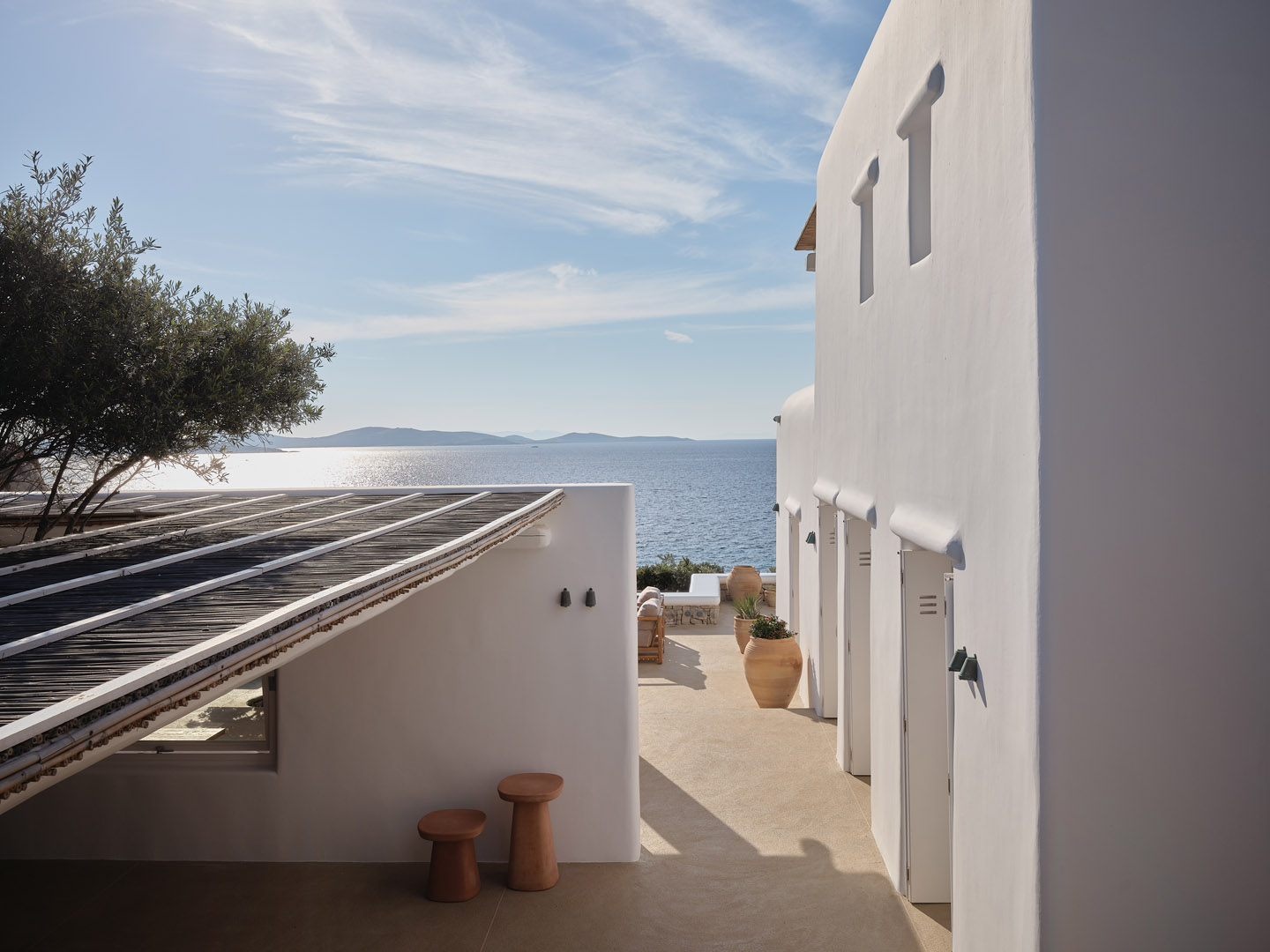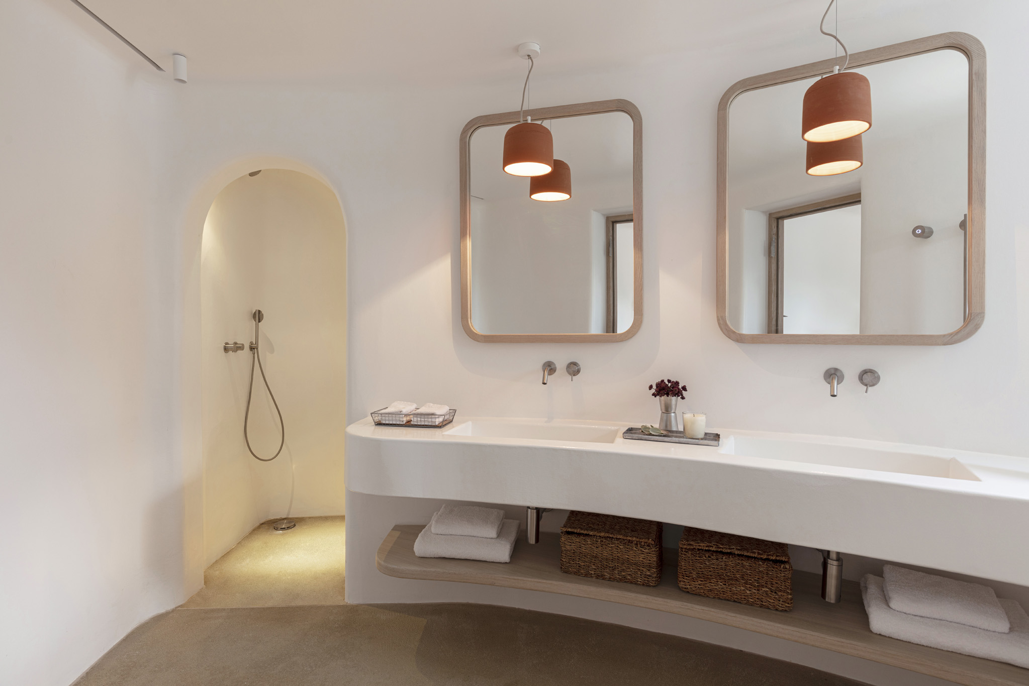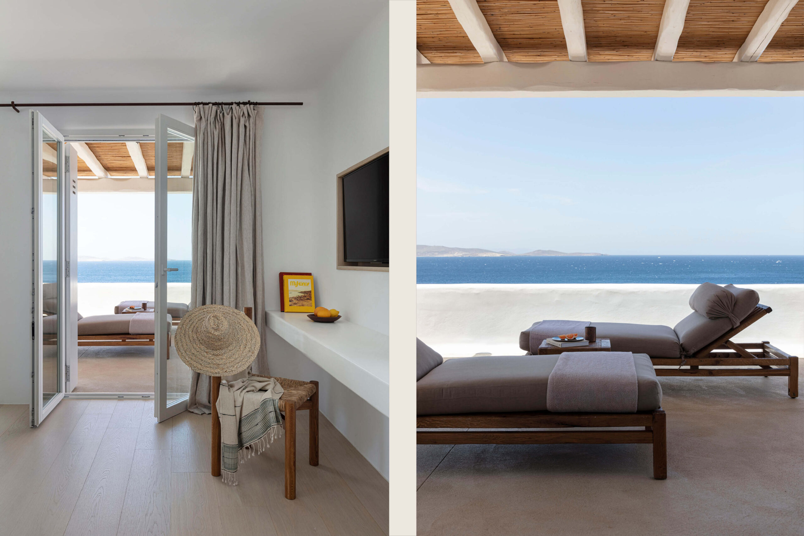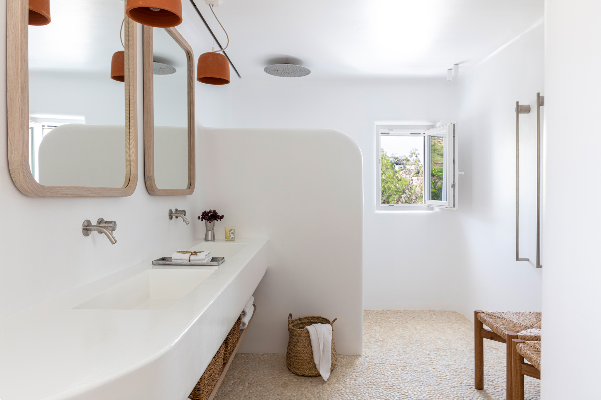 – 1 master double bedroom, en-suite bathroom, double sinks, private shaded terrace, sea&sunset views overlooking Delos & Rhenia islands