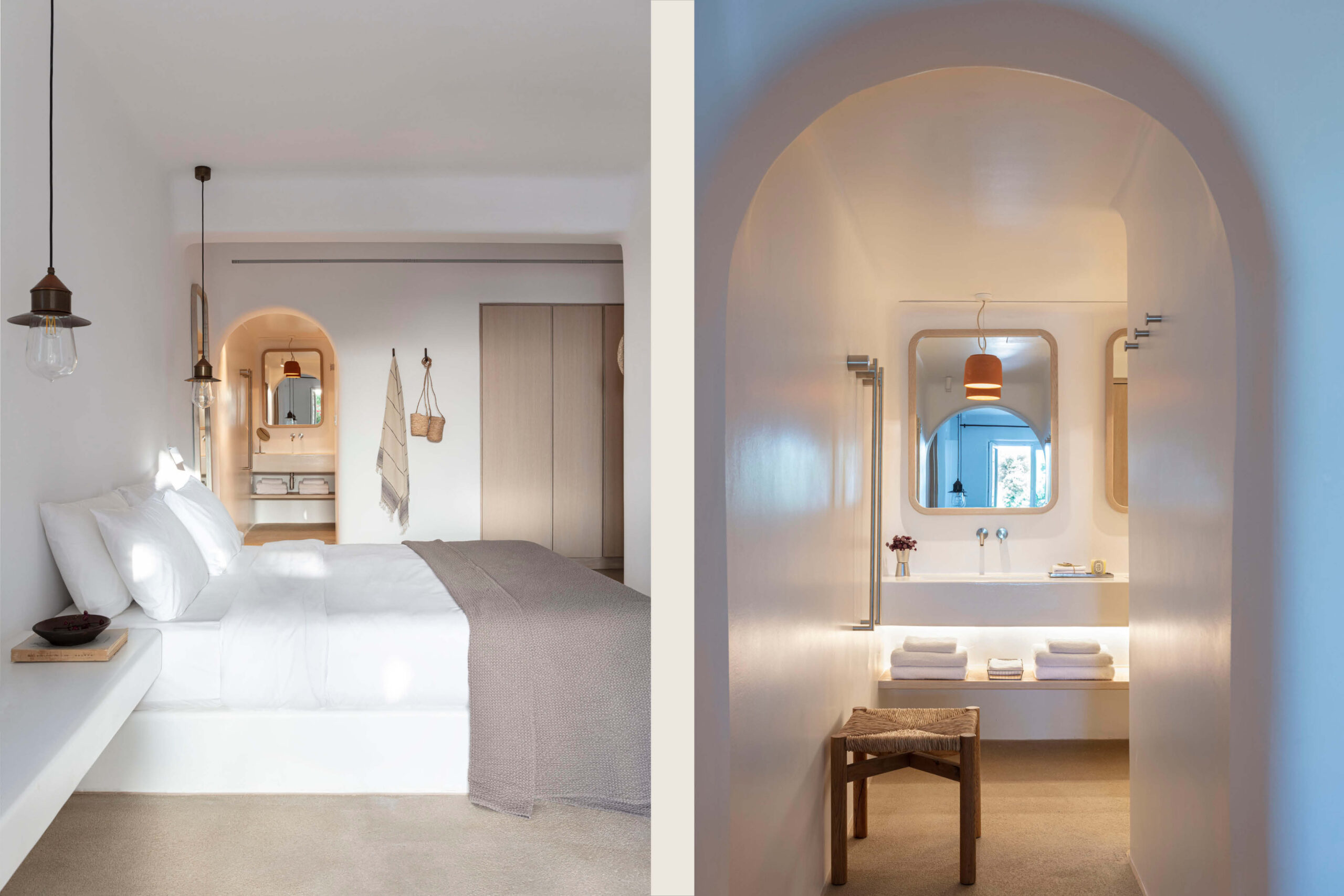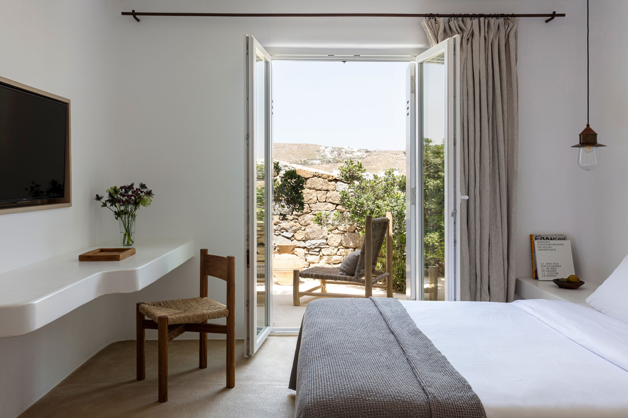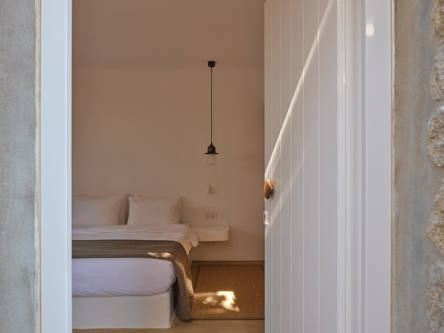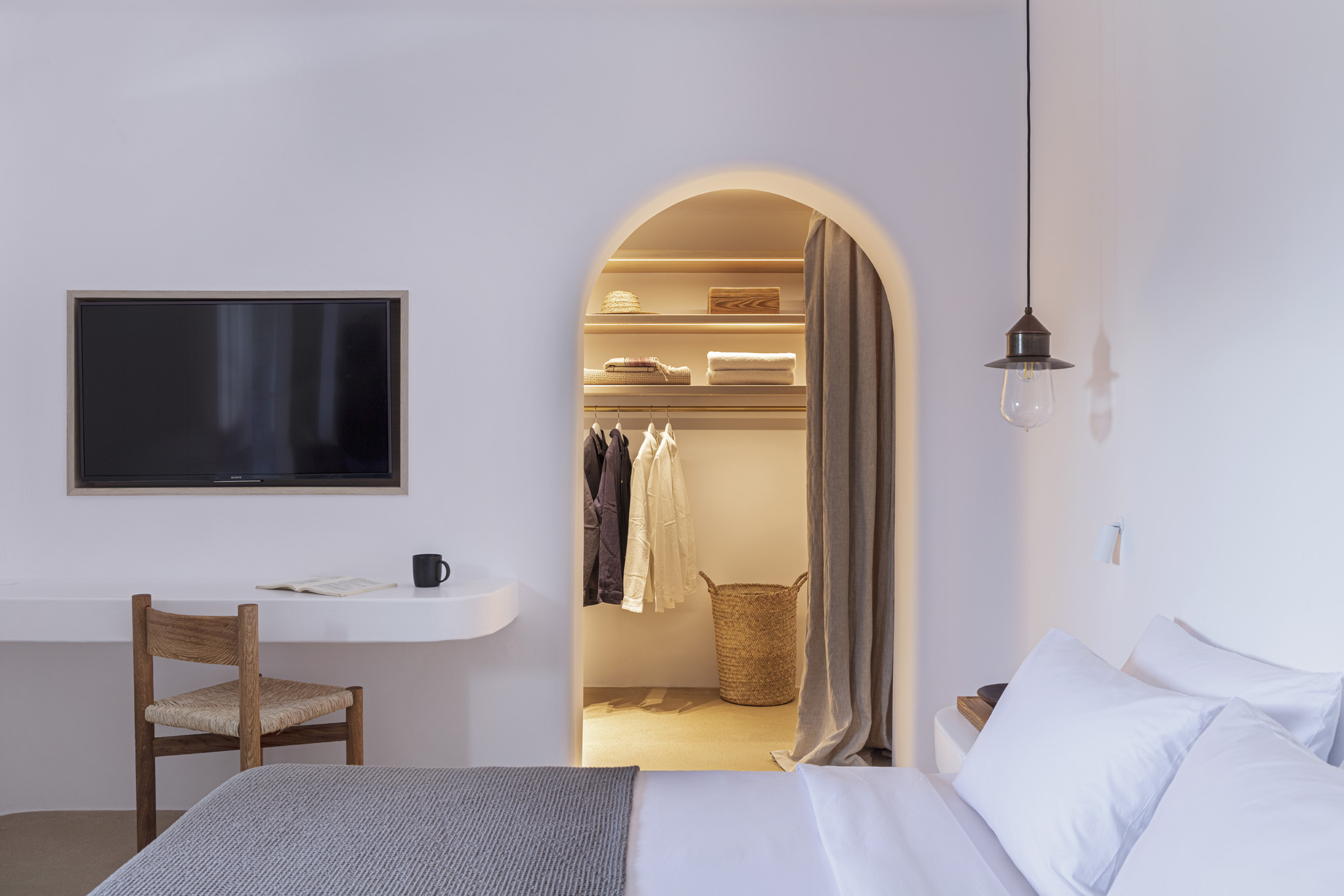 – 1 master double bedroom, en-suite bathroom, double sinks, private shaded terrace, sea&sunset views overlooking Delos & Rhenia islands